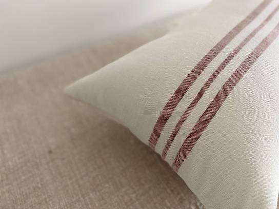 Tejido en algodón con rayas central en rojo suave sobre fondo blanco grisáceo en ambas caras.