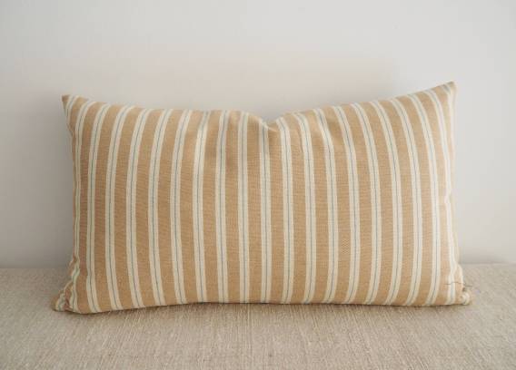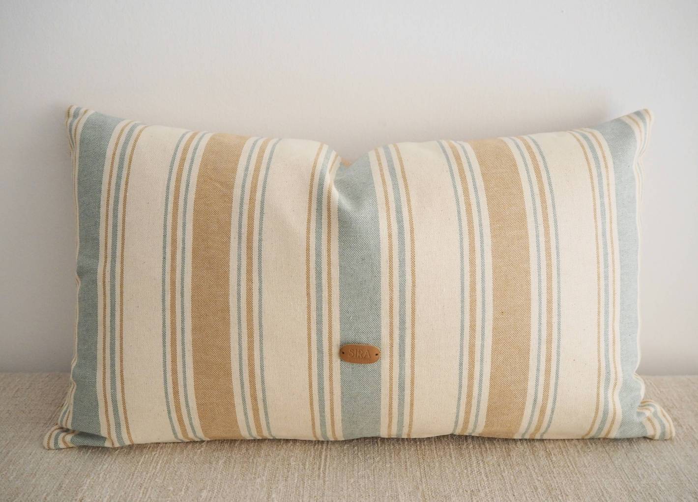 Cojín reversible a rayas en ambos lados en color arena, ratural y azul/turquesa.