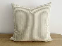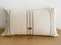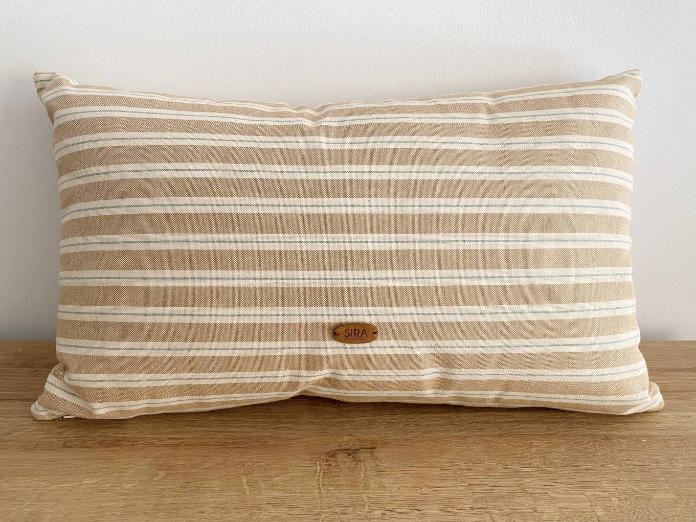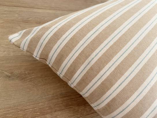Cojín a rayitas arena, aqua y blanco en ambos lados.