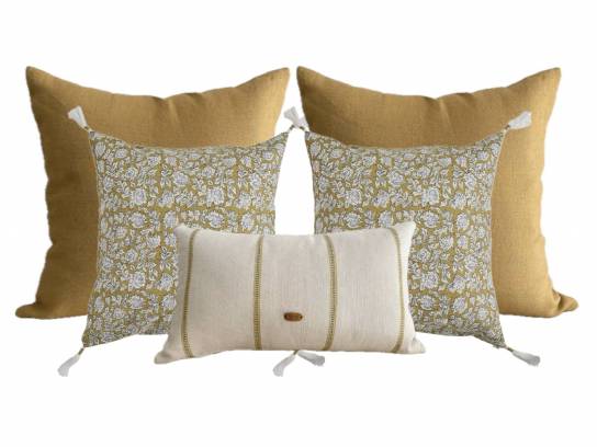 Tono mostaza con pompones en blanco.