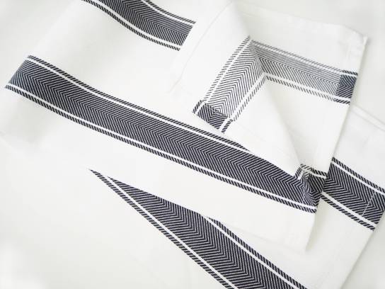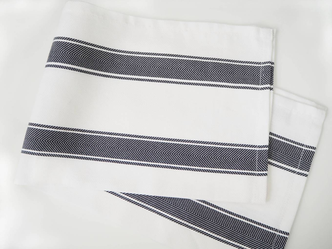 Paño de algodón 100% rayas negras sobre fondo blanco. Ideal para secar, o también se puede usar para servir el te como mantelito, o para decorar colocado en un frutero o para servir el pan. Tiene multitud de usos!