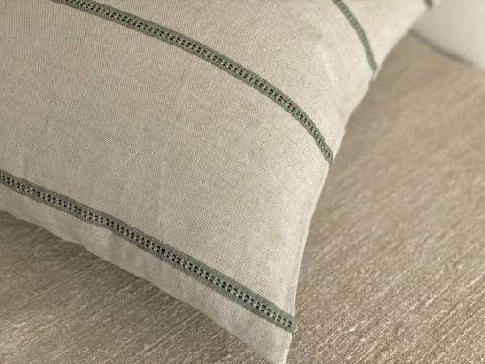Tejido tejido a rayas verdes e hilo fino negro en la raya sobre fondo grisáceo/piedra. Composición en lino y algodón de 270 gramos.