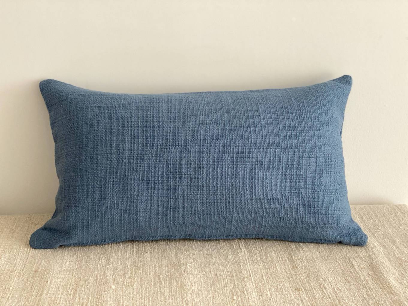 Cojín confeccionado en color azul mar, ideal y atemporal.