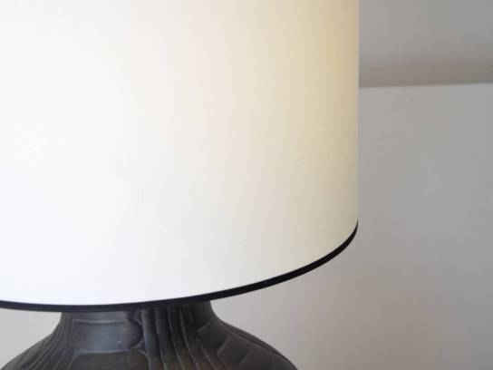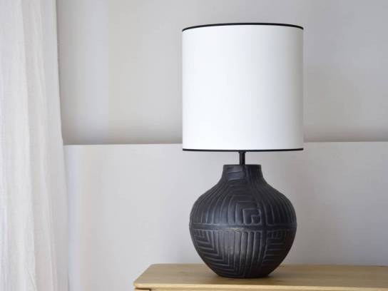 LÁMPARA DE MESA REALIZADA EN HIERRO Y ACABADO EN COLOR NEGRO Y DETALLES EN GRIS AZUL ANTIGUO. EL HIERRO ES TRABAJADO A MANO DE FORMA ARTESANAL.