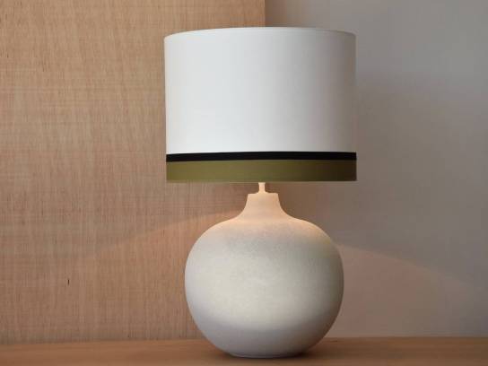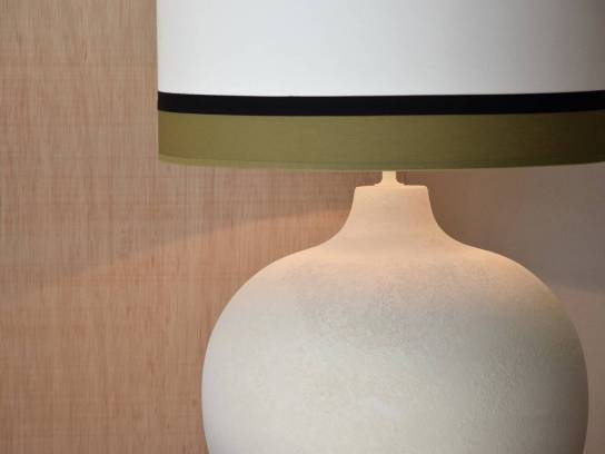 LÁMPARA DE MESA REALIZADA EN PASTA CERÁMICA CON ACABADO NATURAL LIGERAMENTE RUGOSO EVOCANDO UNA TEXTURA PÉTREA..