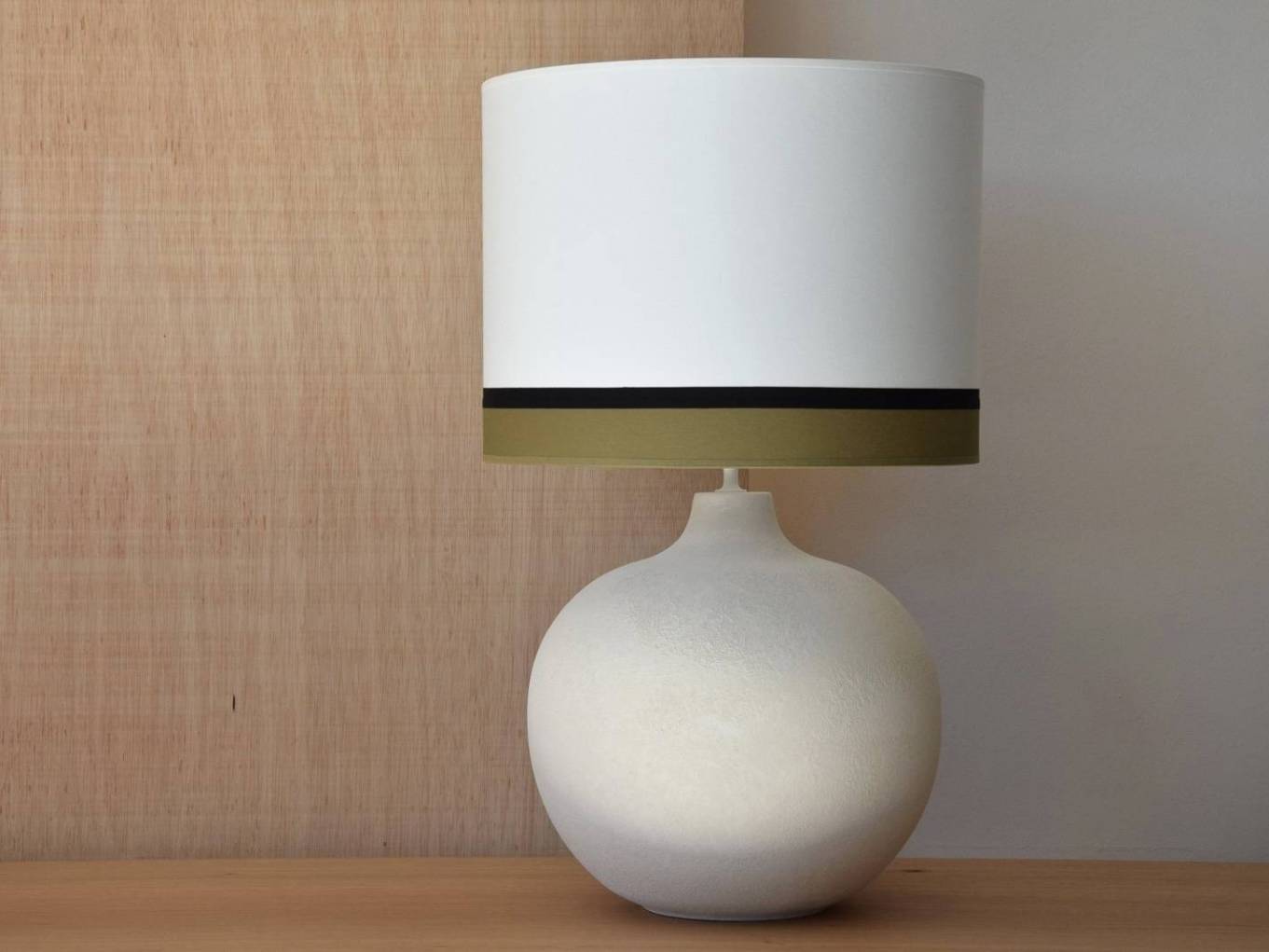 MEDIDAS BASE: 33XH41CM. PANTALLA CILINDRICA REALIZADA EN ALGODON COLOR BLANCO ROTO, VIVO INFERIOR DE 5 CM EN VERDE MUSGO Y VIVO DE UNION EN NEGRO. MEDIDAS PANTALLA: 40XH30CM CASQUILLO E27.