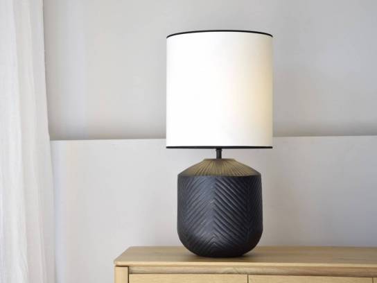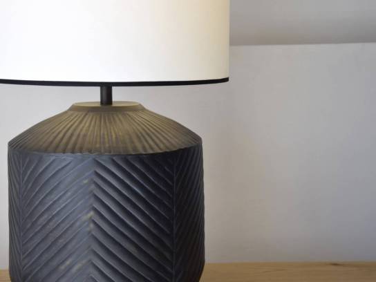 LÁMPARA DE MESA REALIZADA EN HIERRO Y ACABADO EN COLOR NEGRO Y DETALLES EN GRIS AZUL ANTIGUO. EL HIERRO ES TRABAJADO A MANO. CADA PIEZA ES ÚNICA.PASTA.