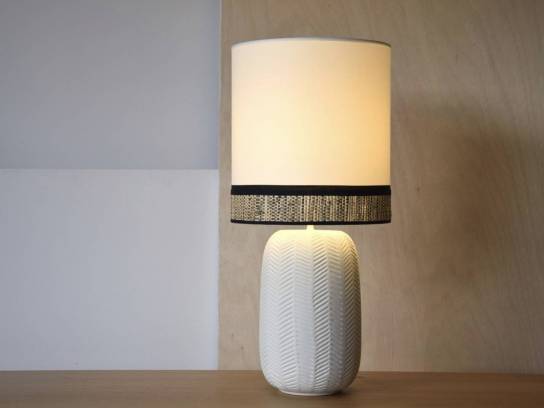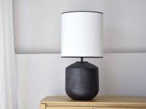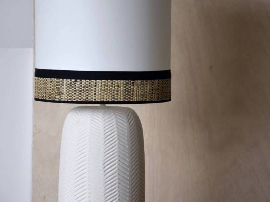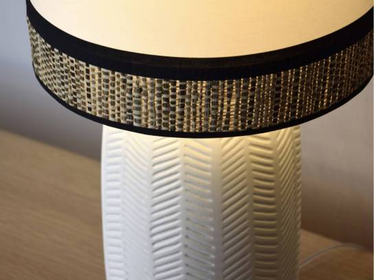 LÁMPARA DE MESA REALIZADA EN PASTA CERÁMICA CON ACABADO NATURAL MATE. LA BASE PRESENTA UN RELIEVE EN ESPIGA DEATACANDO SU ASPECTO NATURAL