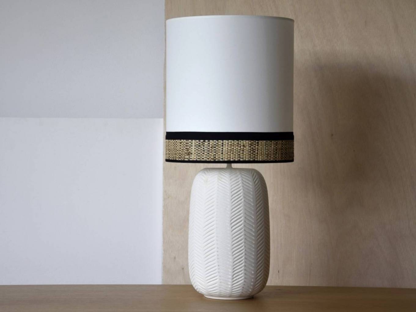 PANTALLA CILÍNDRICA REALIZADA EN ALGODÓN BLANCO ROTO VIVO INFERIOR DE 6 CM EN RAFIA NATURAL Y VIVO DE UNION EN NEGRO.
