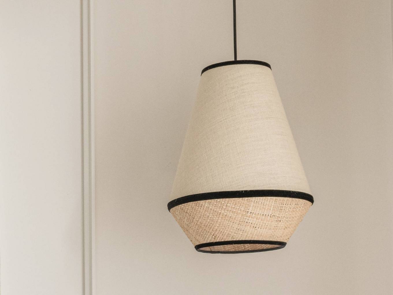 LÁMPARA COLGANTE PARTE DE ARRIBA YUTE CLARO Y ABAJO ARPILLERA. CABLE TÈXTIL Y FLORON NEGRO.