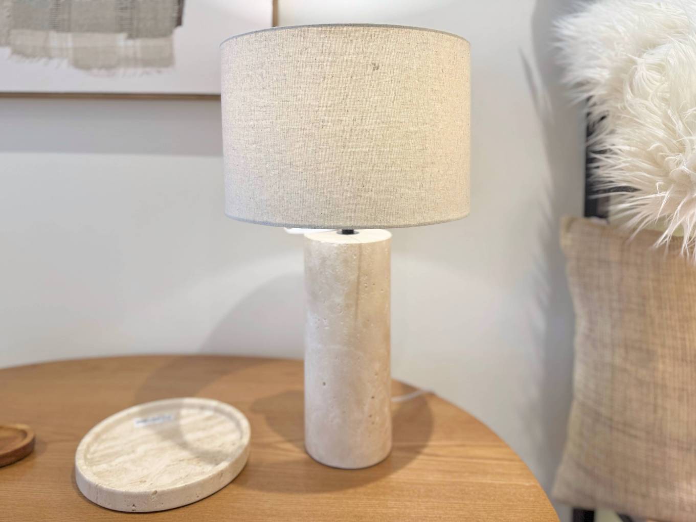 LÁMPARA DE SOBRE MESA DE LINO Y TRAVERTINO IDEAL.