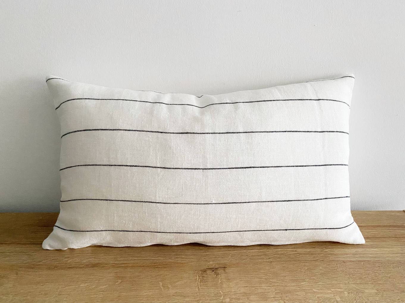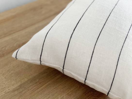Color blanco de fondo y rayas negras finas, composición lino 100%, cálido para ofrecer a tu estancia confort y diseño.