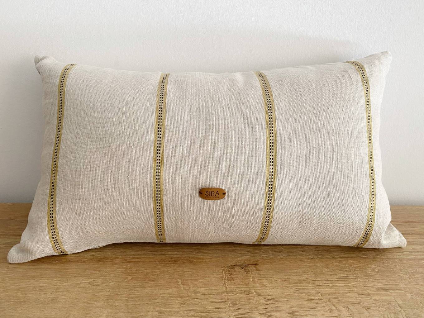 Este cojín es de color cálido por sus rayas, combina ideal con mostazas, verdes o naturales.