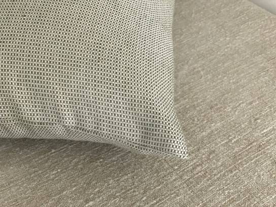 Tejido en hilos de color blanco, beige y verde, composición en lino y algodón de 300 gramos, cálido para ofrecer a tu estancia confort y diseño.