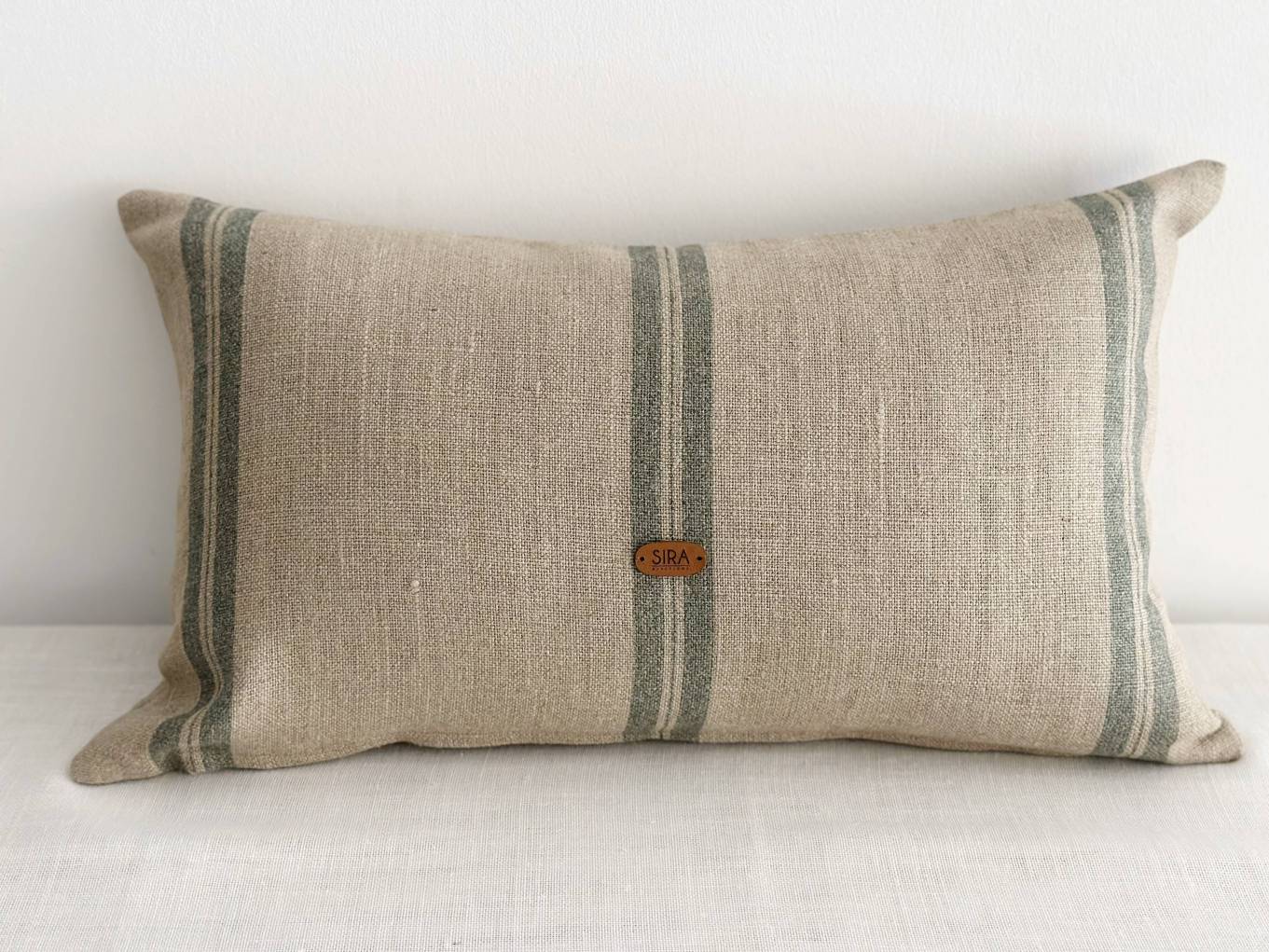 Color arena de fondo y rayas verde en ambas caras, toda la composición es en lino de 490 gramos.