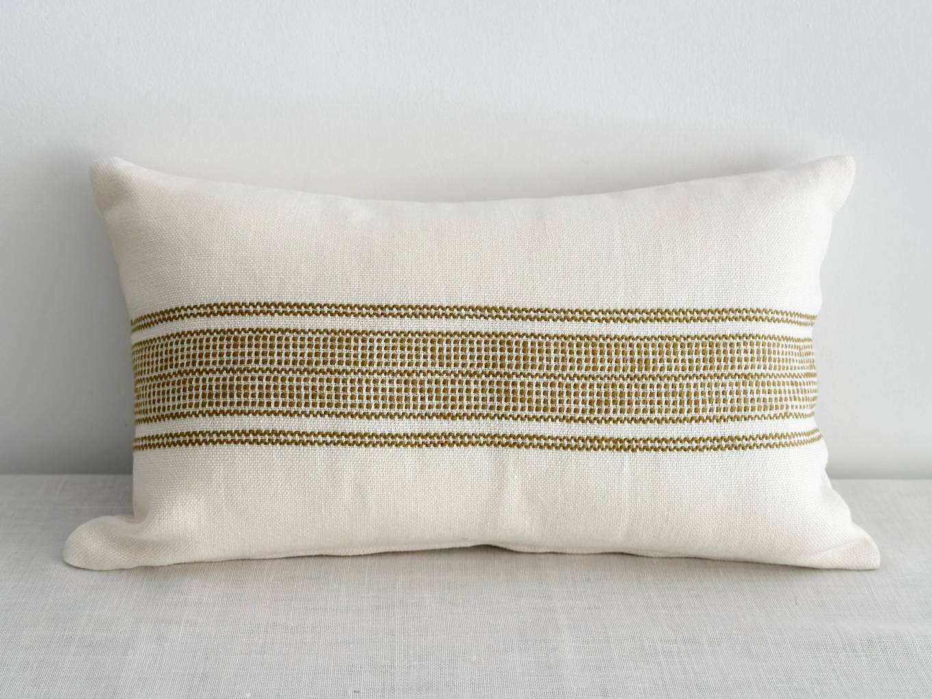 Tejido tejido a rayas mostaza/pistacho sobre fondo claro. Composición en lino y algodón.