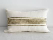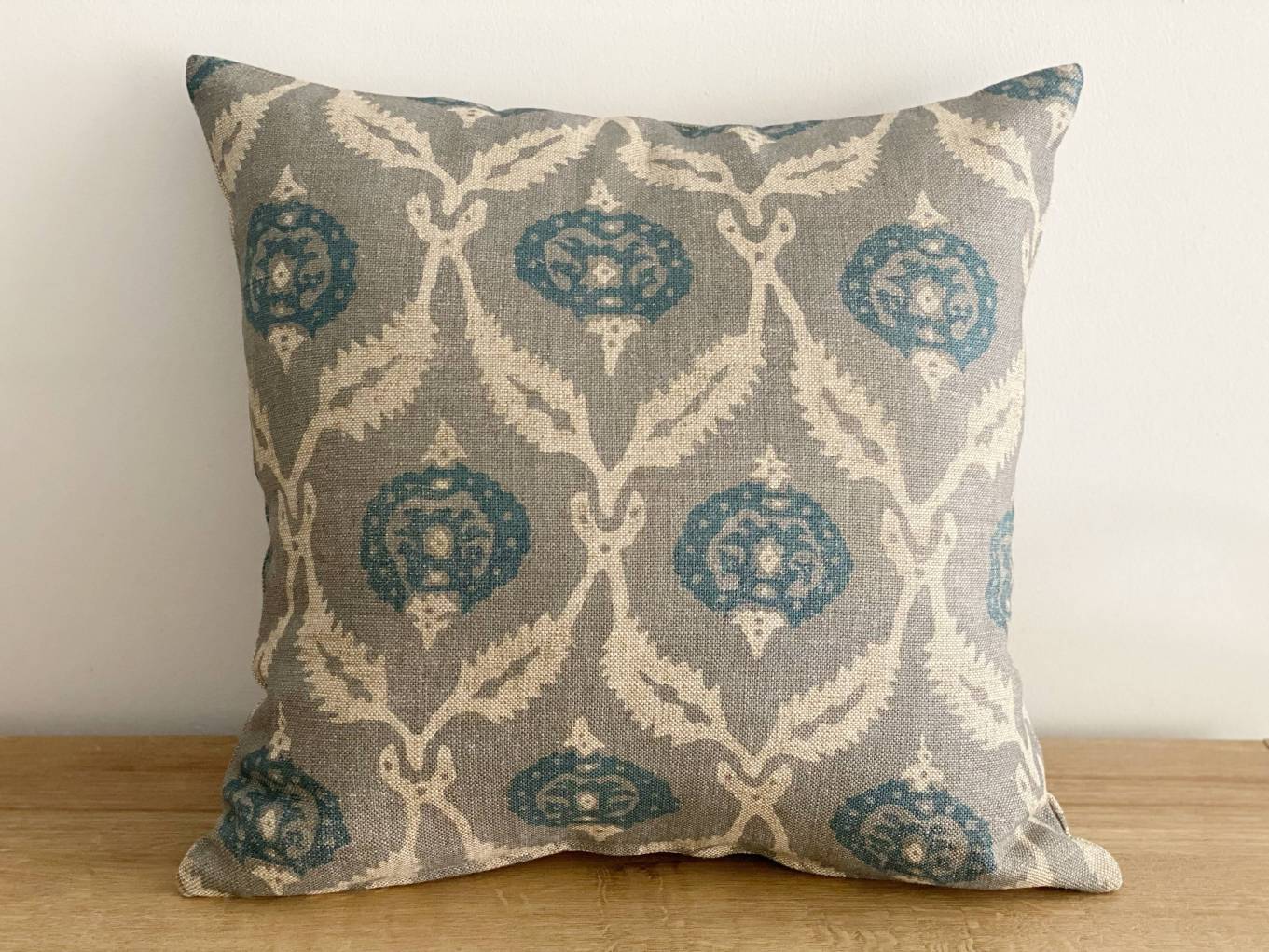Tejido estampado de lino de 400 gramos muy combinable con los otros cojines de la colección de rayas celeste y liso.