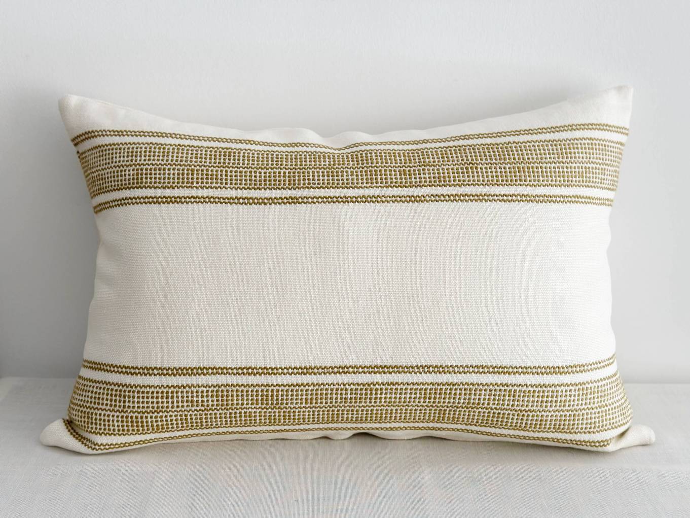 Tejido tejido a rayas mostaza/pistacho sobre fondo claro. Composición en lino y algodón.