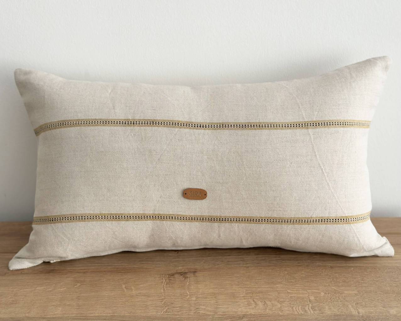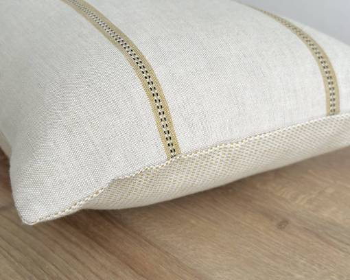 Este cojín es de color cálido por sus rayas, combina ideal con mostazas, verdes o naturales.