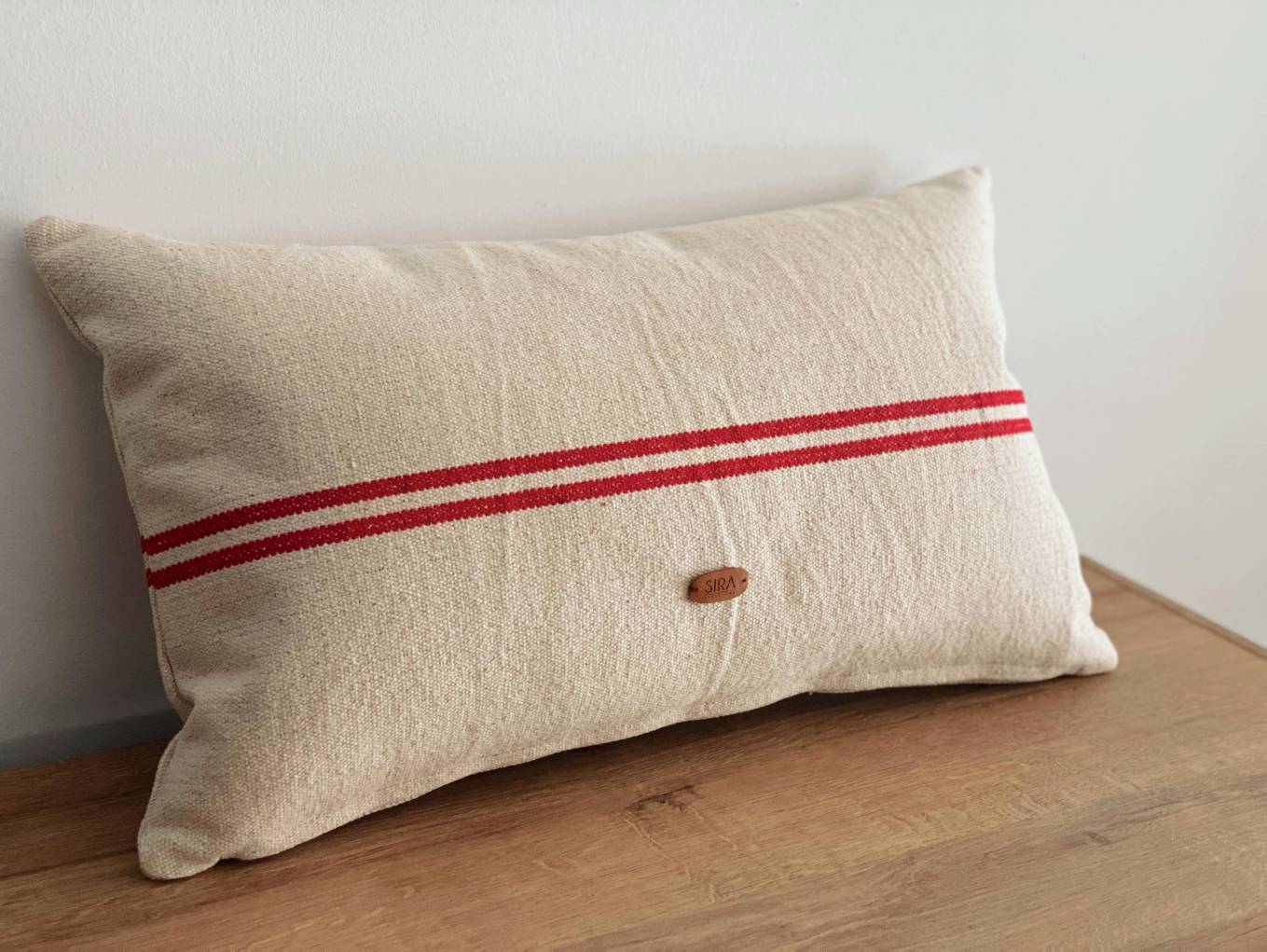 La raya roja central del cojín, atrae nuestra atención, evoca emociones de intensidad y amor.