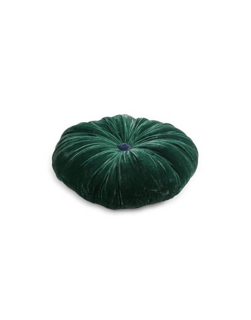 Cojín está confeccionado en terciopelo de seda suave y fluido color verde. La composición del tejido en seda plisado y el acabado con botón le otorgan elegancia y refinamiento.