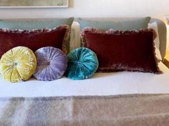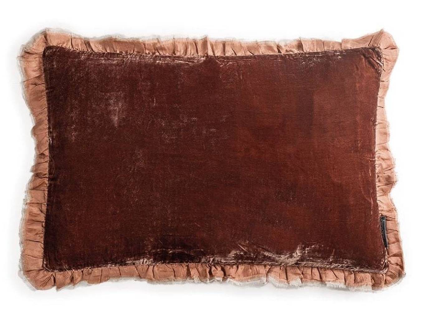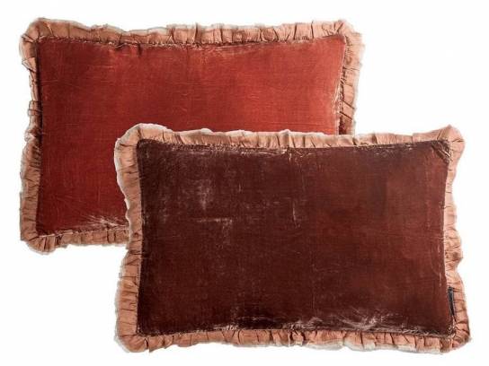 Cojín confeccionado en terciopelo de seda suave y fluido color rojizo reversible en dos tonos uno en cada cara del cojín. La composición del tejido en seda plisado y el perfil en terminación de fino algodón le otorgan elegancia y refinamiento.