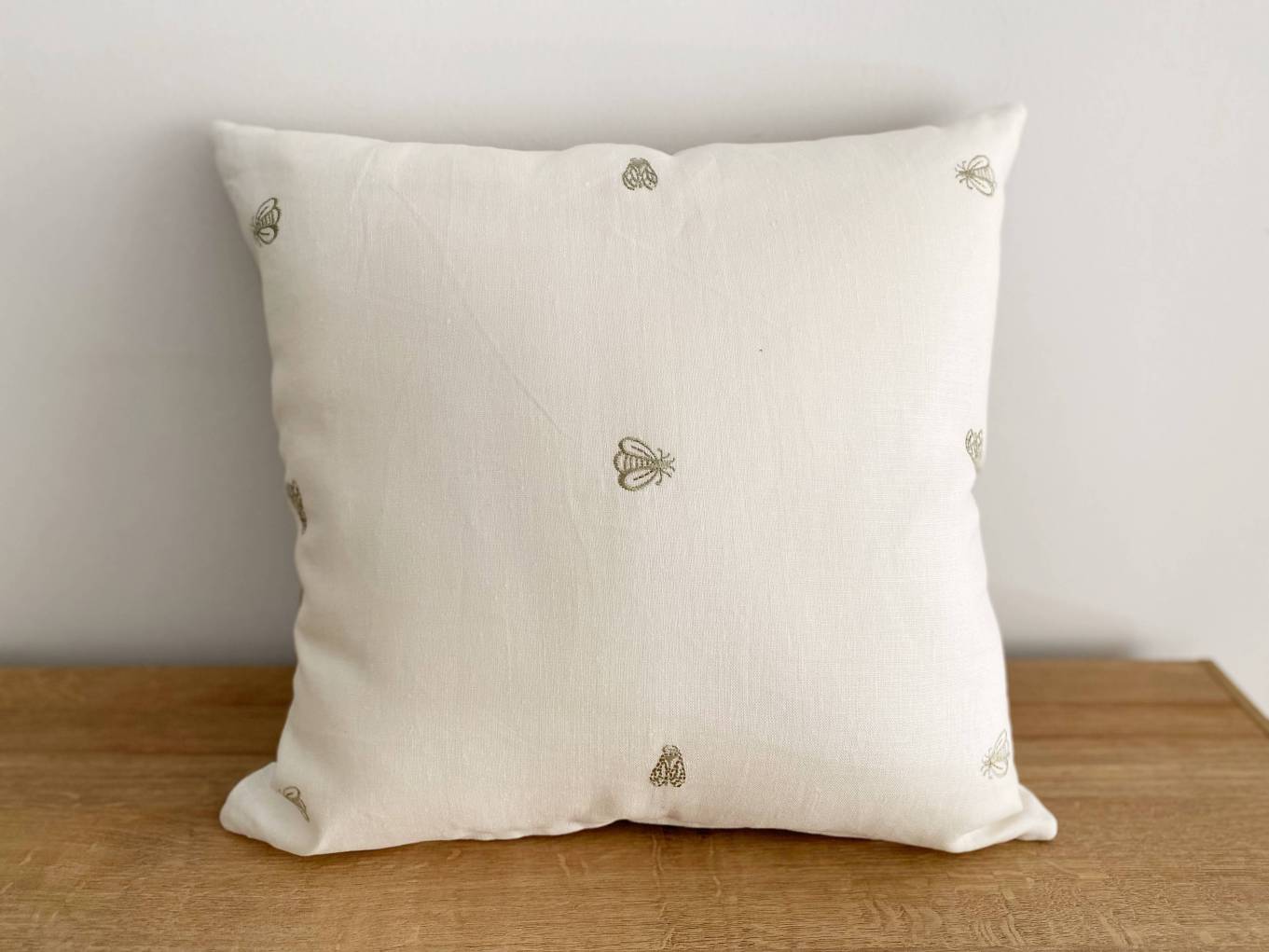 Cojín confeccionado en elegante estampado de lino y motivo tejido de chicharra provenzal, tejido vintage. Cierre de cremallera invisible. Incluido relleno.