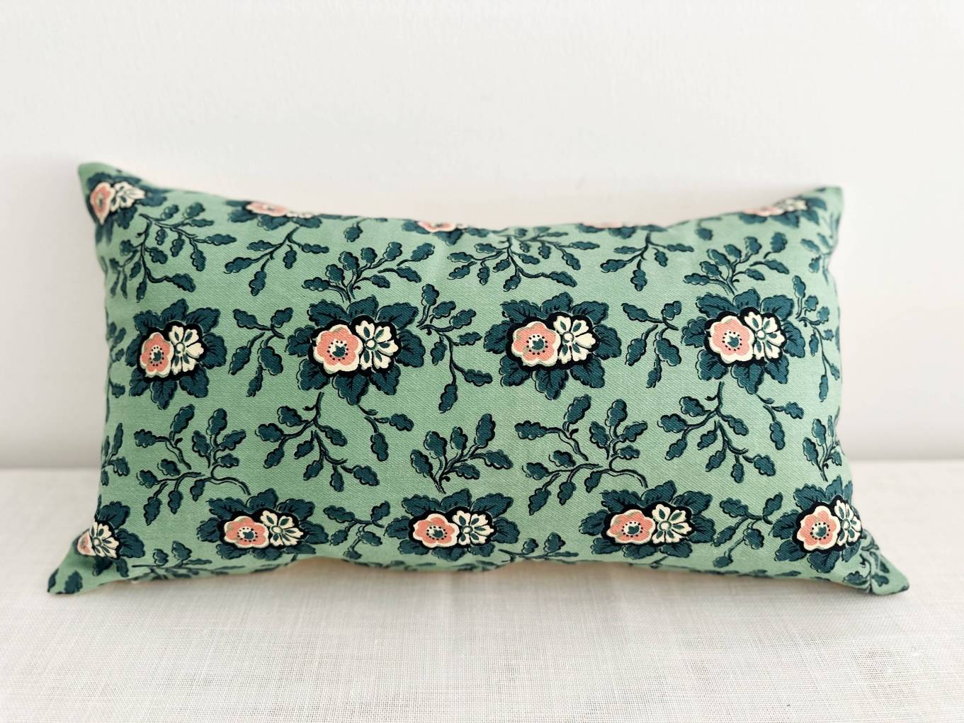 Cojín de tejido de algodón floreado en verde precioso.